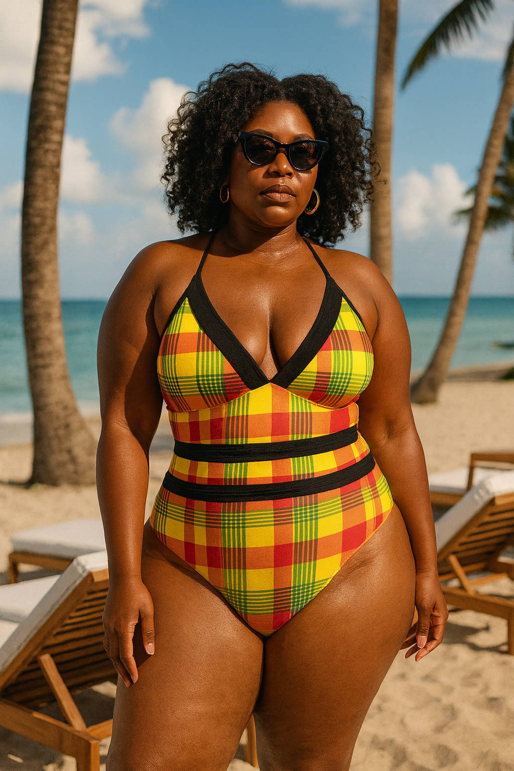 Maillot de bain à bande de dentelles noires chic en Madras Sunshine.