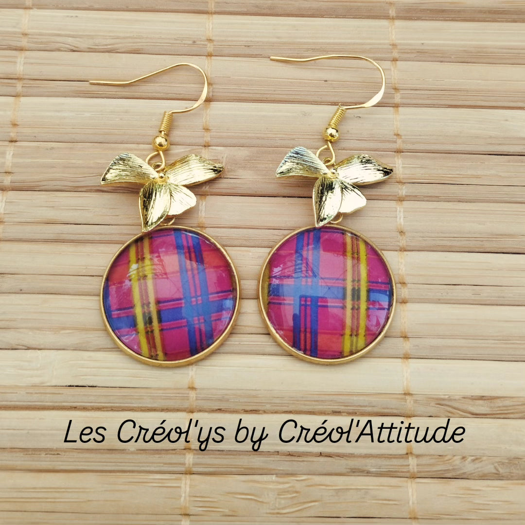 Boucles d'oreilles pendantes avec ses feuilles et des rond Madras.