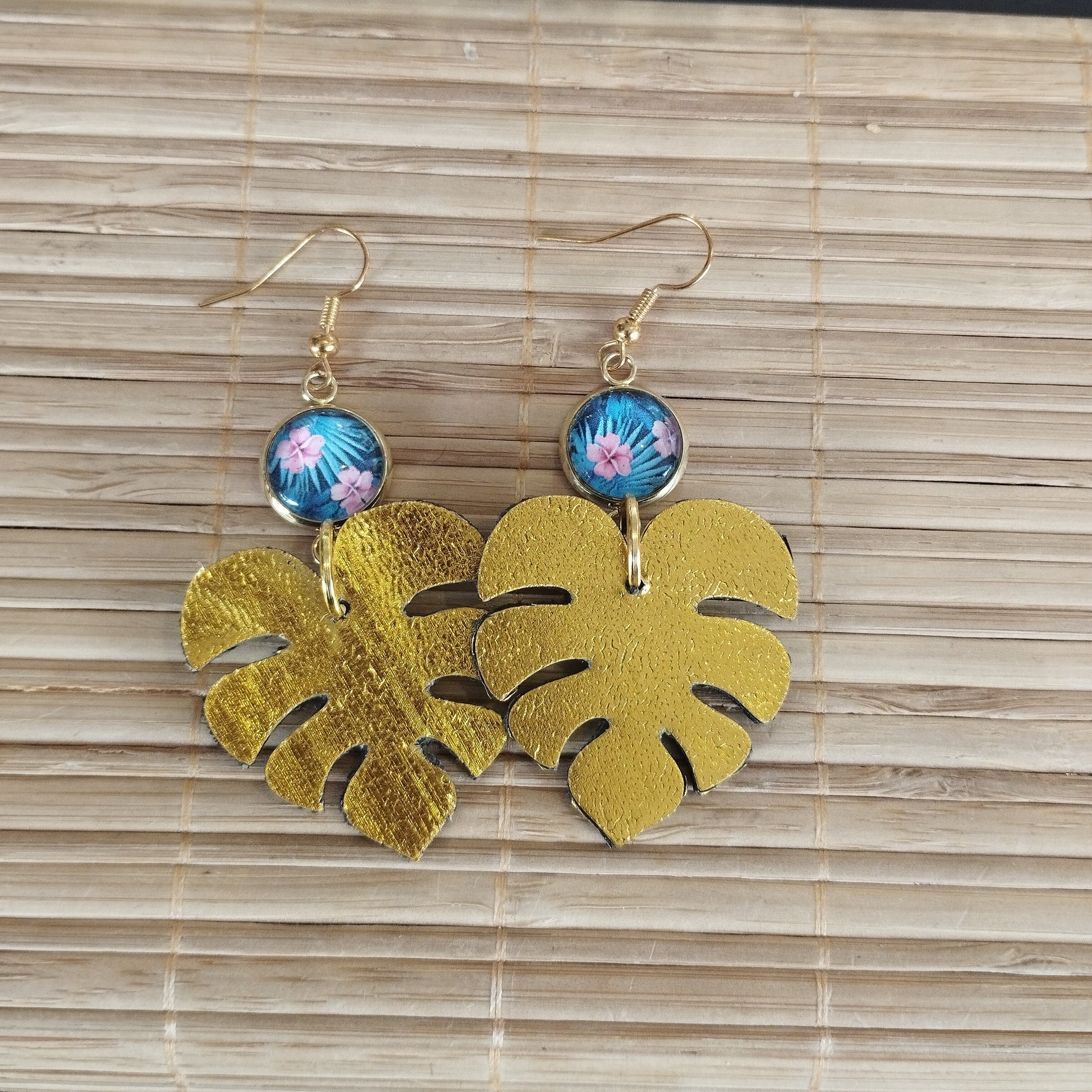 Boucles d'oreilles pendantes avec un rond motif tropical et des feuilles monsteras dorées en cuir, ambiance tropicale chic.