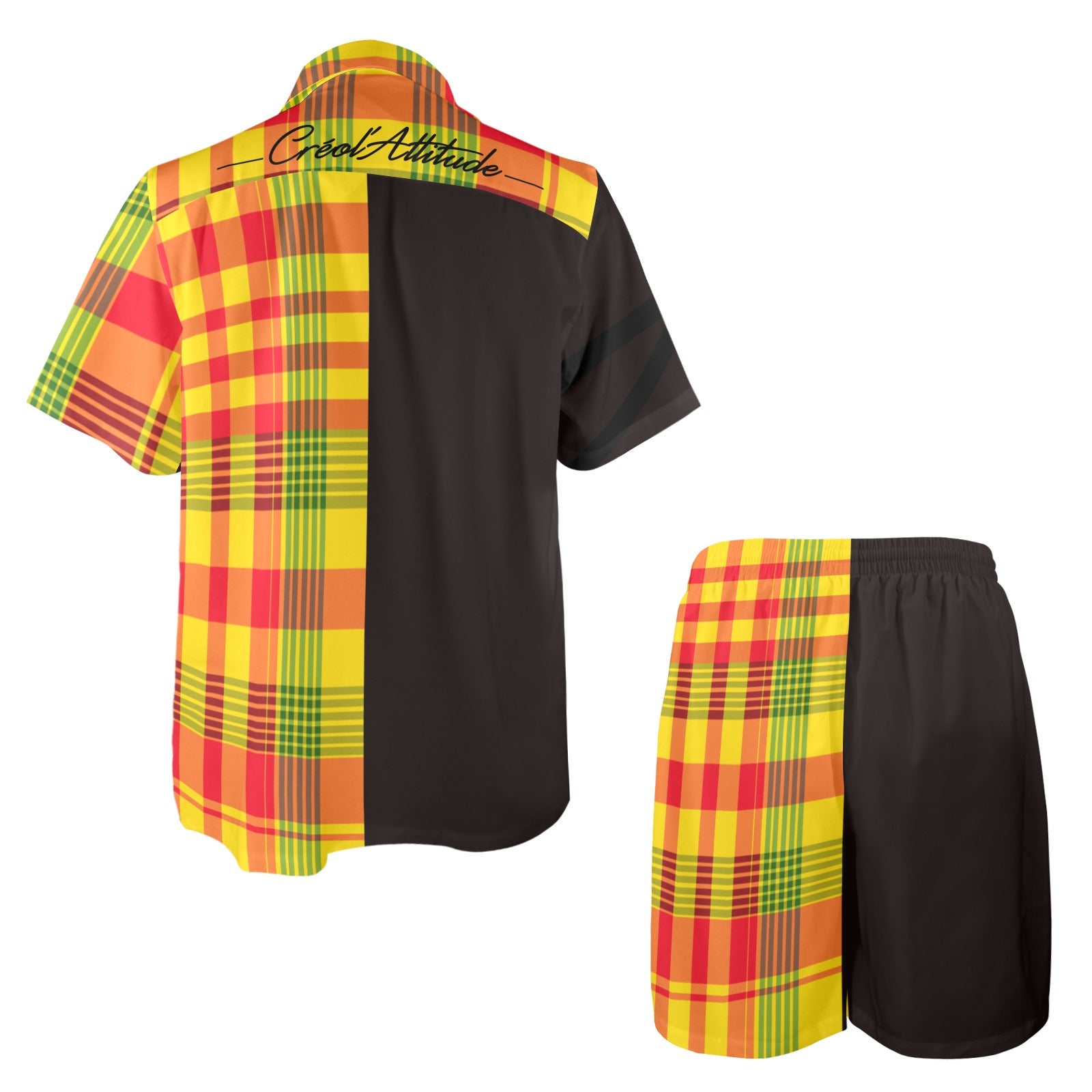Ensemble chemise et short imprimé Madras Sunshine et sa carte de la Guadeloupe ou de la Martinique avec des hibiscus blancs. Ensemble de plage look stylé créole urbain Madras.