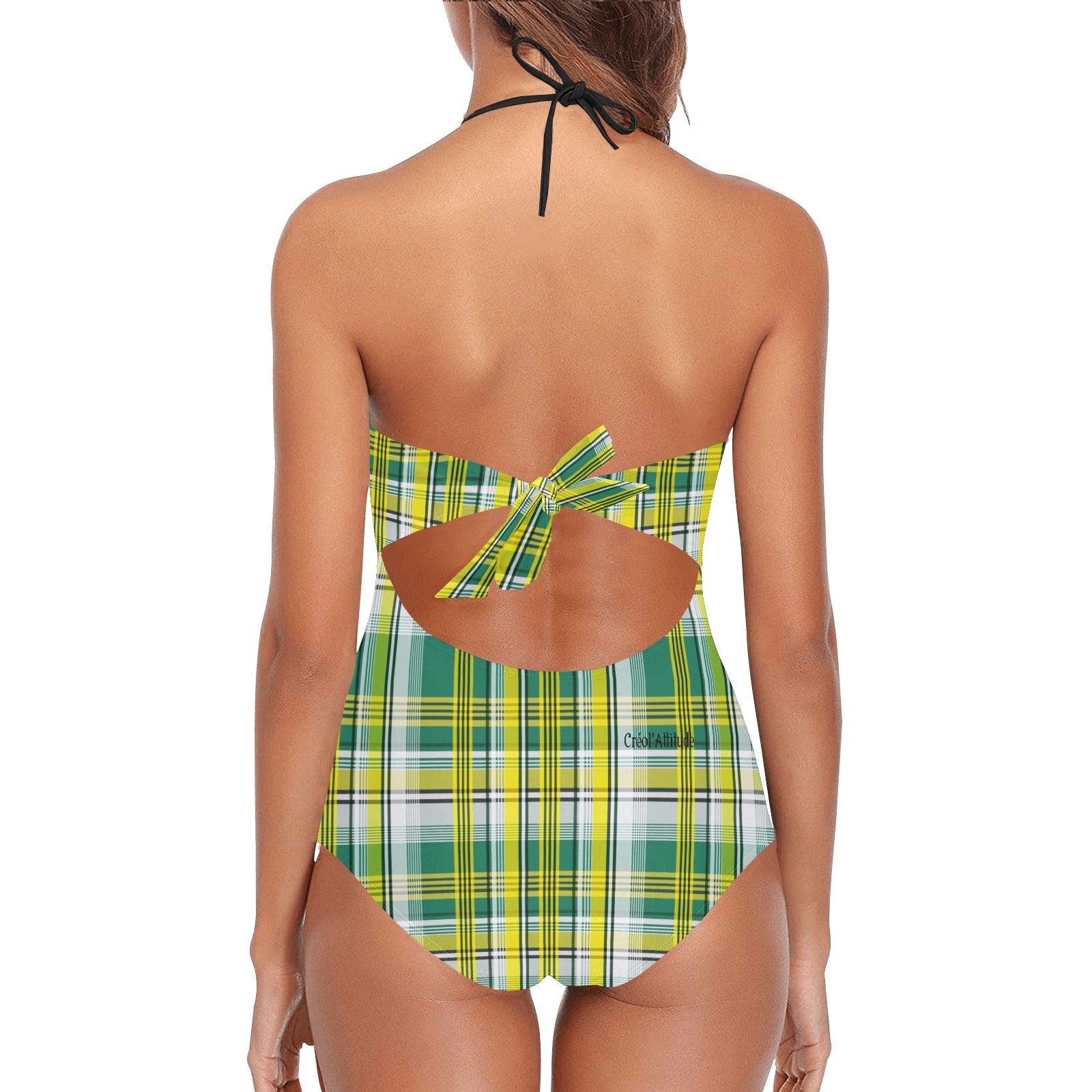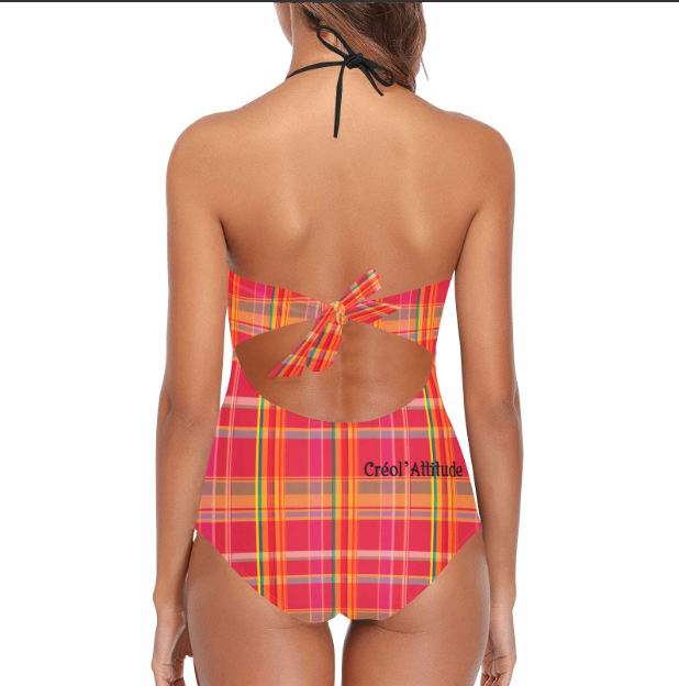 Maillot de bain créole à bande de dentelles noires chic dans différents coloris de Madras du plus chatoyant au plus épuré.