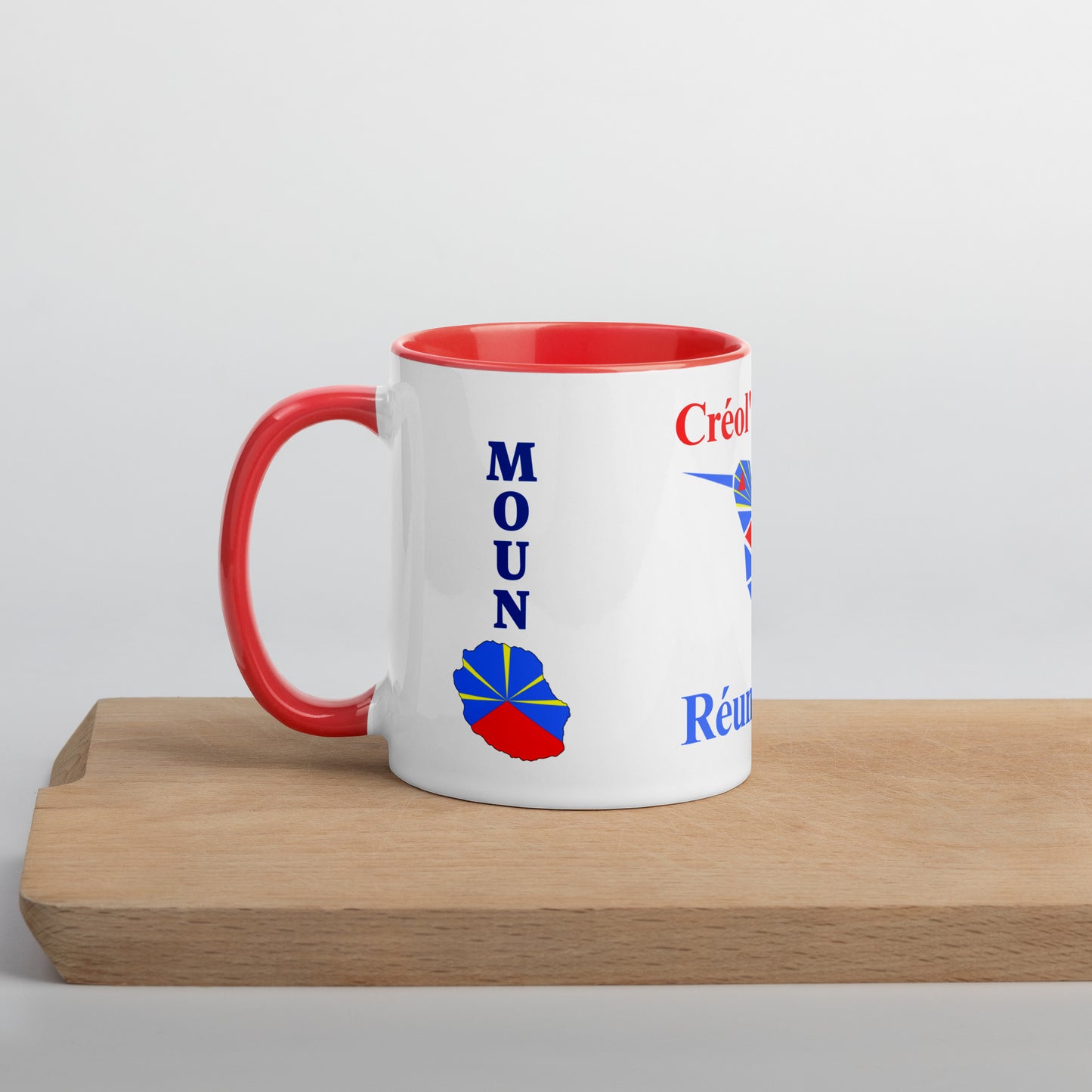 Mug intérieur coloré avec ta carte drapeau de la Réunion et ton département(s) 974 de cœur avec une expression créole caractéristique : "Moun" (personne/gens), Réunion, 974.